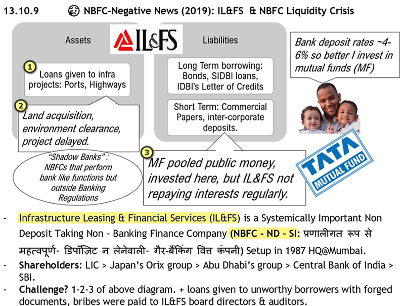 Shadow banking systemβs assets are risky and illiquid. If there is a βbank runβ like situation (depositors / investors demanding the money bank) these shadow banks canβt honour the obligations. As seen in the ILFS crisis (2019) β