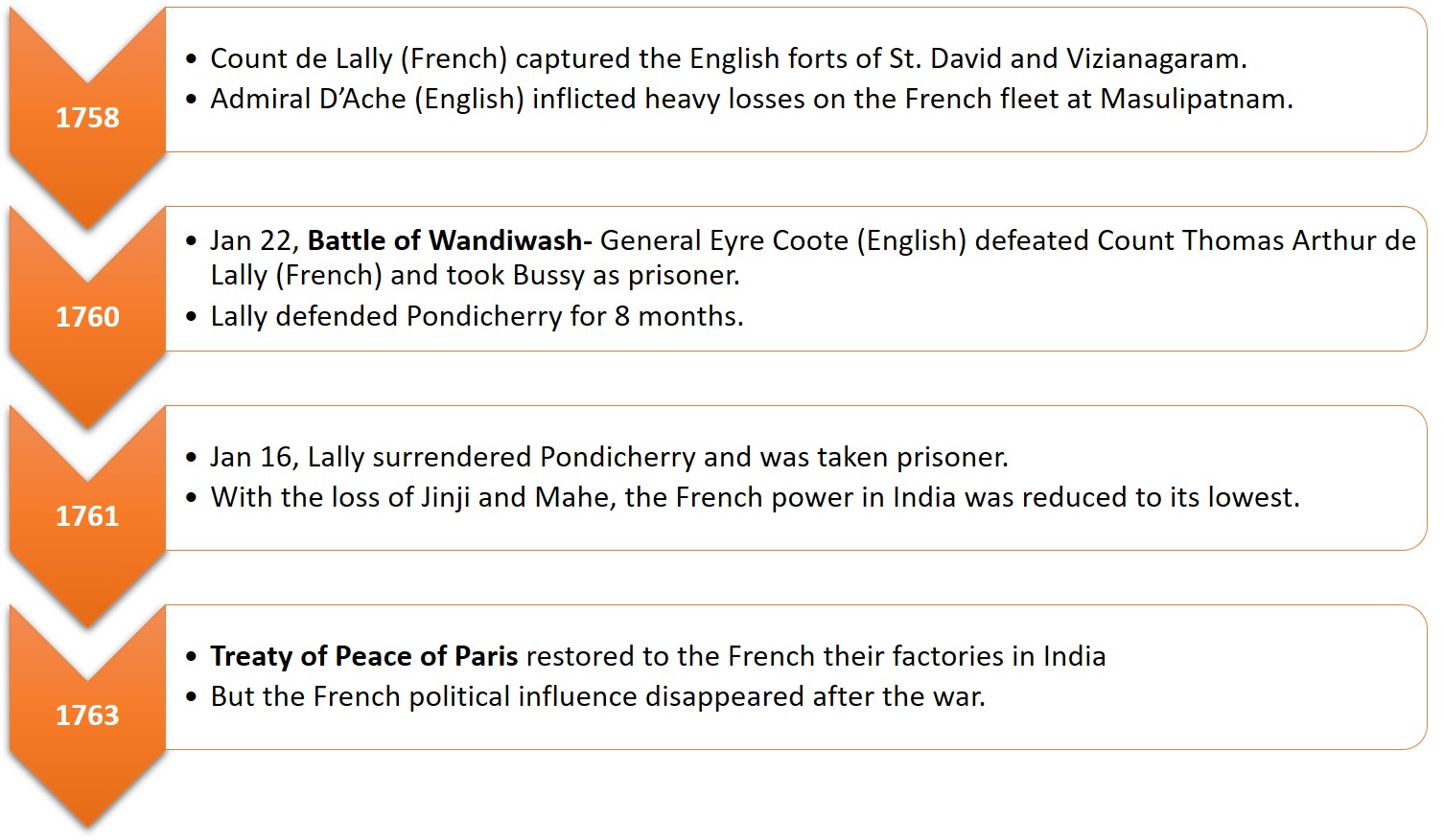 - Hyderabad & territories near Pondicherry and some areas on the Orissa Coast (including Masulipatnam) were ceded to the French.