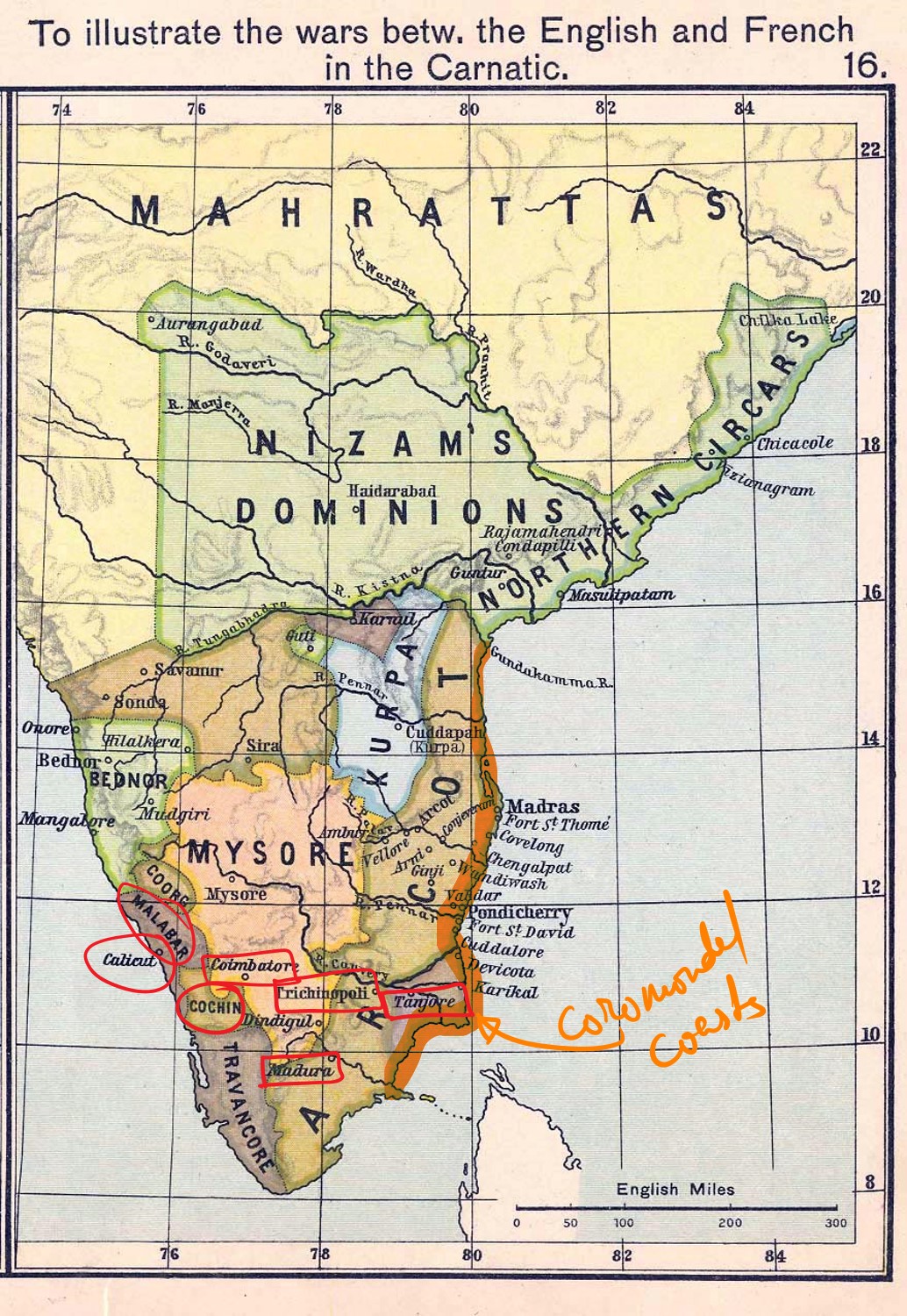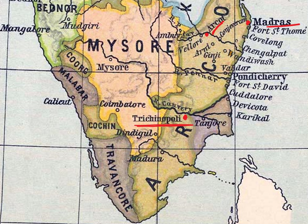 - French team defeated and killed Anwarud-din at the Battle of Ambur (near Vellore) in 1749.