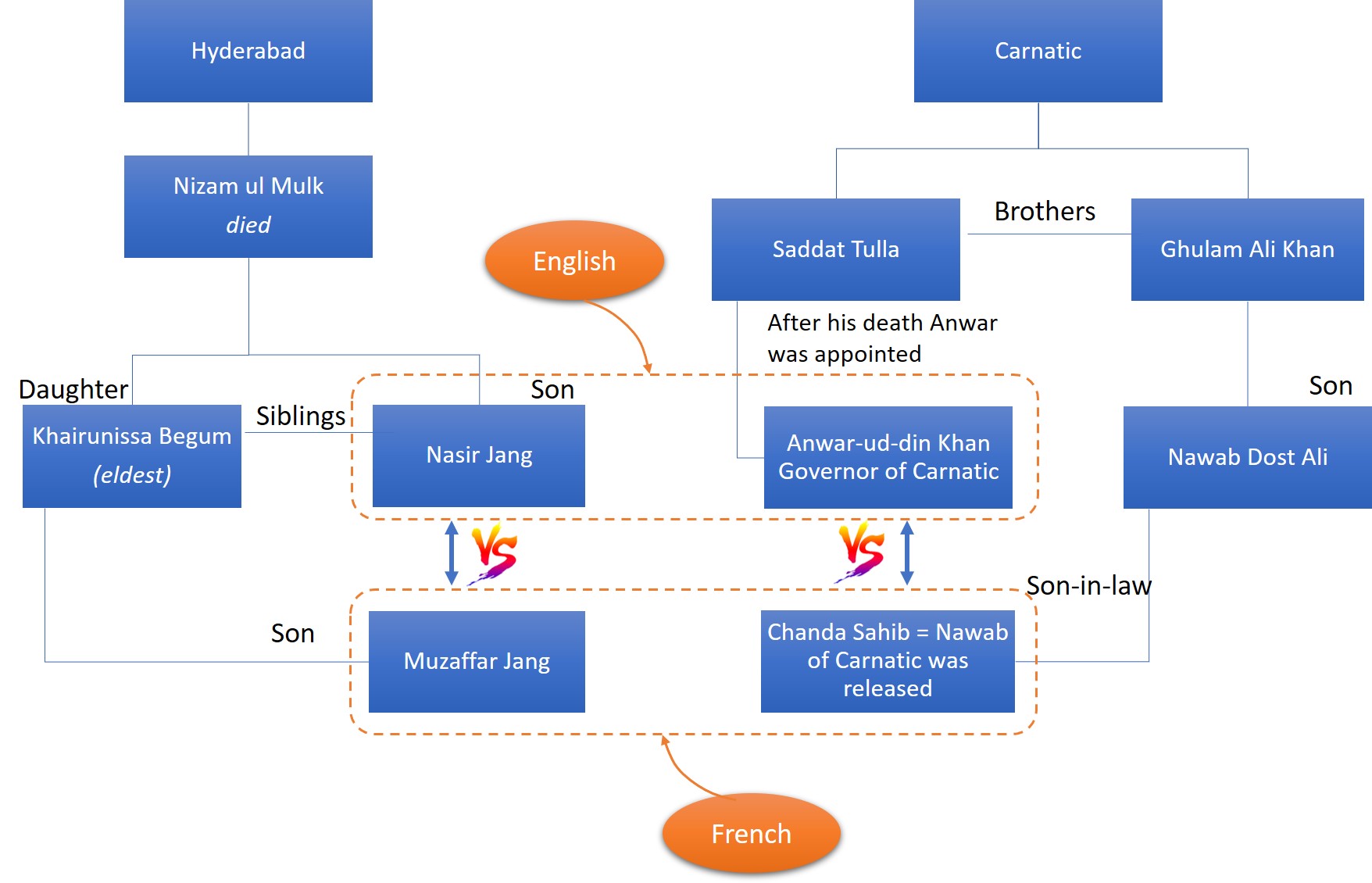 Dupleix, the French governor who had successfully led the French forces in the First Carnatic War, sought to increase his power and French political influence in southern India by interfering in local dynastic disputes to defeat the English.
