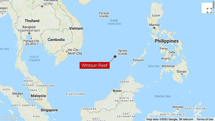 - The Philippine coast guard detected the boats in line formation at the boomerang-shaped Whitsun Reef, around 320 km (175 nautical miles) west of Palawan Island.