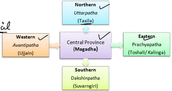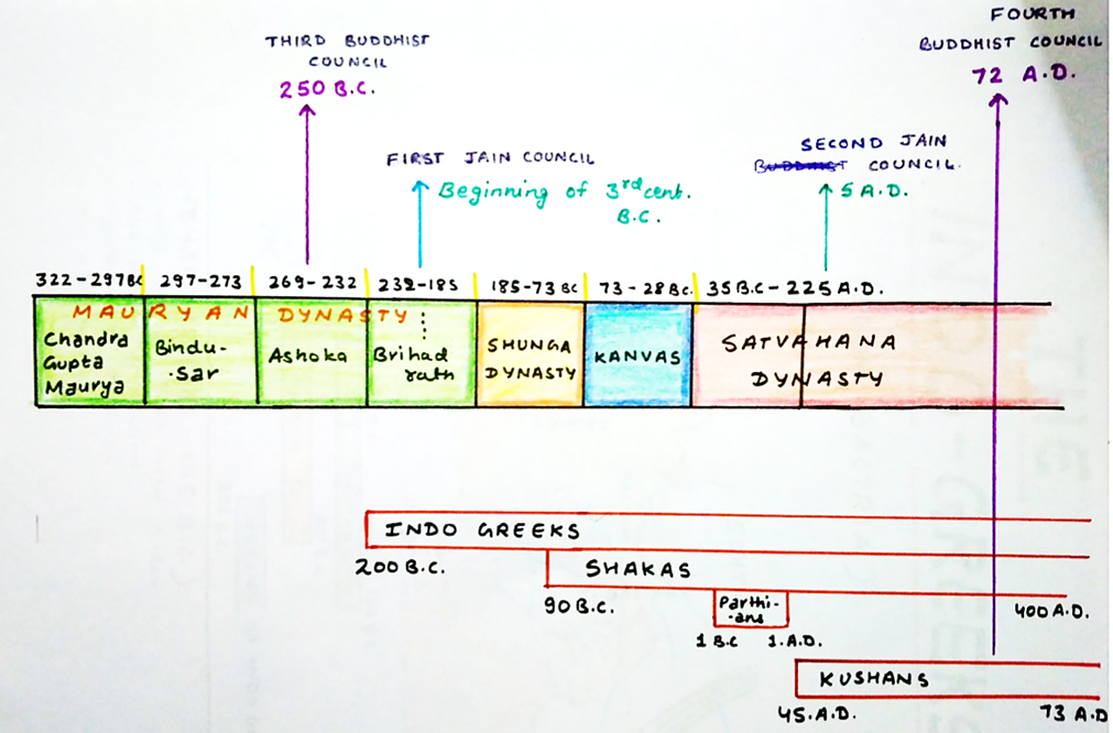After Ashok’s death–> weak rulers–> Provinces declared independence–> Maurya swere replaced by Sungas–>