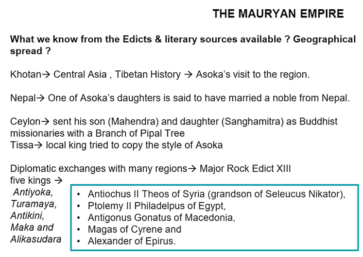 Tamil texts → Mauryan rule upto Tamil Nadu and Kerala.