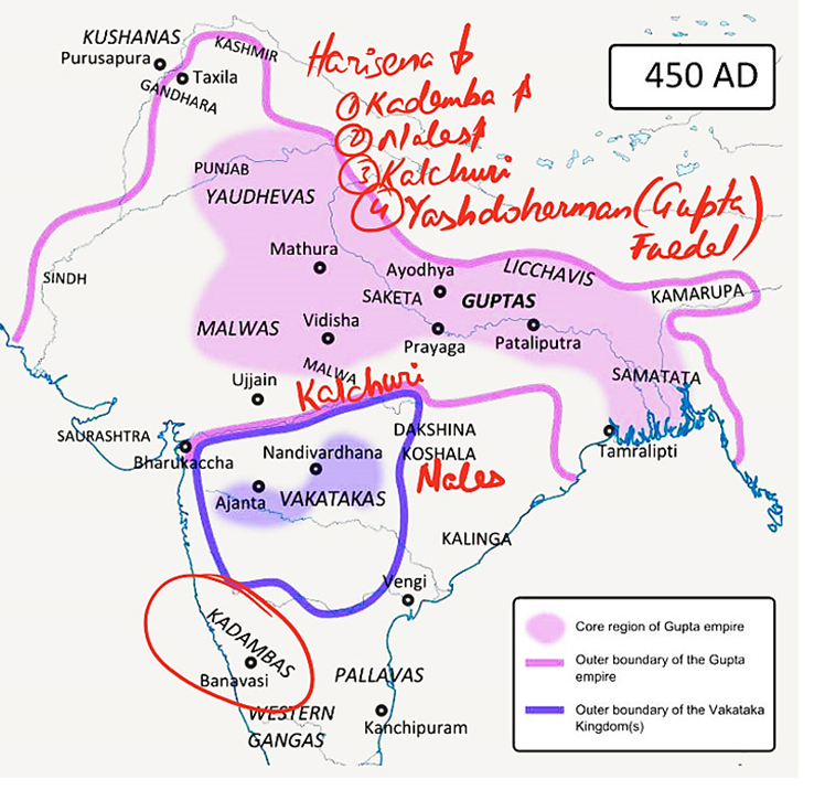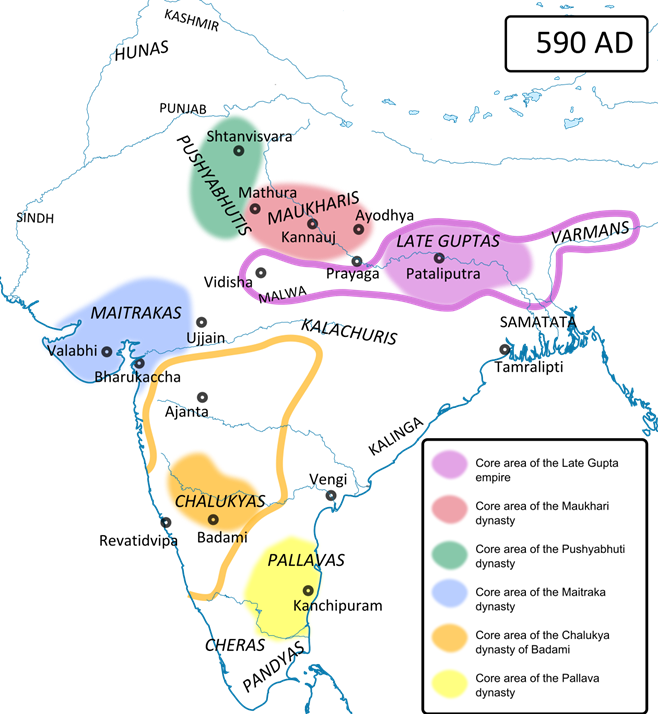 Harsha (c. 590–647 CE)–> member of the Vardhana dynasty; and was the son of Prabhakaravardhana who defeated the Alchon Huna invaders,[6] and the younger brother of Rajyavardhana, a king of Thanesar, present-day Haryana.