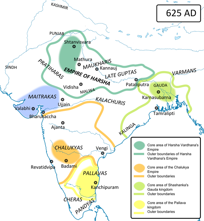 His Empire covered much of North and Northwestern India and South until Narmada River; and eventually made Kannauj (in the present Uttar Pradesh state) his capital, and ruled till 647 CE.[7] Harsha was defeated by the south Indian Emperor Pulakeshin II of the Chalukya dynasty in the Battle of Narmada when Harsha tried to expand his Empire into the southern peninsula of India.