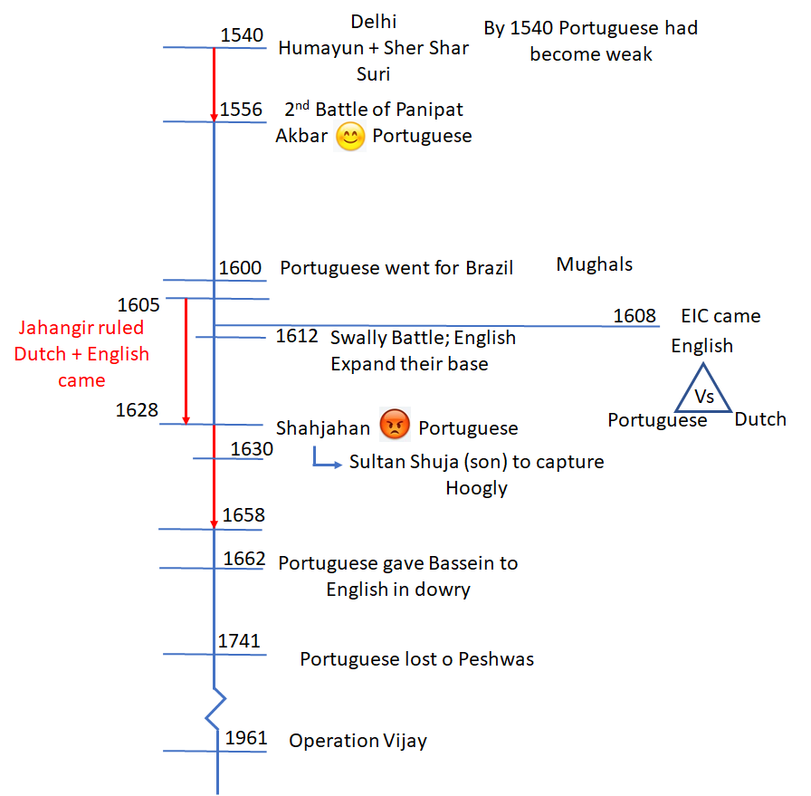 - 1534: Bahadur Shah (Gujarat) vs Humayu (Mughal).. took help of Cunha (Portuguese) and gave island of Bassein & Promised Diu.