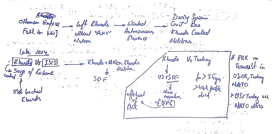 Keep in mind, this was at a period in time when ISIS had established its capital city (Raqqa) in Kurdish territory. So Kurdish militias were going to be fighting ISIS regardless of whether they had US support. And the US chose to work closely with the Kurds to combat ISIS rather than the Syrian military because the Syrian government had very close ties with both Iran and Russia. As you can see, multiple factions are working within the country. With ISIS at its peak, all those factions were relatively focused on dealing with that threat. There were sporadic instances where Syrian and Kurdish troops would attack each other, but they weren’t each other’s “primary” enemies so long as ISIS was in play. So fast forward again to today. ISIS has been largely defeated. Kurdish forces pretty much control northern Syria and consider themselves their own separate nation (Rojava) from the rest of the country. This is where Turkey comes in. As history shows, the Kurds want to establish their own nation in the areas that make up eastern Turkey, northern Iraq & Syria, and western Iran. The Kurds have been relatively uninhibited in the expansion of their territory right up to the Turkish border due to the US-Kurdish relationship over the last few years. And Turkey does not like this. The Kurds are now armed to the teeth with US weapons, have received training from US special operations forces, and have some serious combat experience under their belts. In the eyes of the Turks, they see the Kurds as a serious threat and they have no reason to suspect that the Kurds will not continue their expansion into eastern and southern Turkey. And the only reason Turkey has not acted yet has been due to the US’s involvement and the presence of a few handfuls of US military advisors in northern Syria. The Trump administration has officially decided to pull those advisors out of the Kurdish areas along the Turkish border. And it looks like the Turkish military has begun carrying out strikes on Kurdish positions in the area. The decision to pull those US advisors is a difficult one. On one hand, the Kurds have been a solid ally to the US in the fight against ISIS. On the other hand, ISIS has been pretty much dealt with at this point. It doesn’t look like the Kurds are intent to stop pursuing the establishment of their own independent Kurdistan that will inevitably encompass areas within Turkish borders. And if keeping a few handfuls of US advisors on the ground is the only thing preventing conflict between the Kurds and Turkey, that would mean we are using American troops as human shields to prevent a new war that frankly, doesn’t seem like either side is that interested in avoiding. It’s important to remember that when it comes to politics, rarely is the decision between Good and Bad. More often than not, the decision is between Bad and Worse. Food for thought, hope I helpe